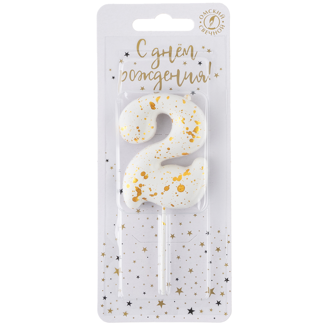 Свеча Цифра, 2 Золотые брызги, на шпажке, Белый, Металлик, 4,3 + 5,2 см, 1 шт. с держат.,